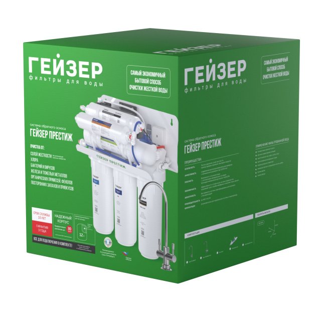 Технология обратного осмоса, использованная в фильтре Гейзер Престиж, заключается в фильтрации воды через полупроницаемую мембрану. Размеры пор мембраны настолько малы, что пропускают только молекулы воды. Размер молекул большинства примесей, а также бактерий и вирусов значительно больше молекул  входящее в комплект, повысит уровень давления до 3-6 атм.