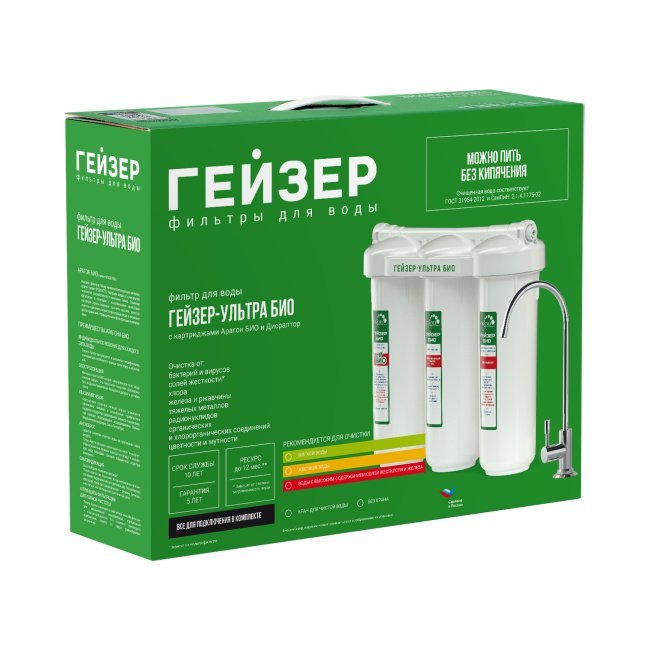 • Двойной ресурс по удалению бактерий и вирусов в фильтре Гейзер Ультра БИО