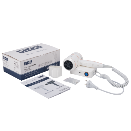 BXG-1600Н1 – Мощный надежный фен нового поколения с функцией Ионизации для сушки и укладки волос. Предназначен для использования в номерных фондах гостиниц и отелей. Фен с настенным держателем для удобной и компактной фиксации. Выполнен из высокопрочного пластика ABS в благородном белом цвете.